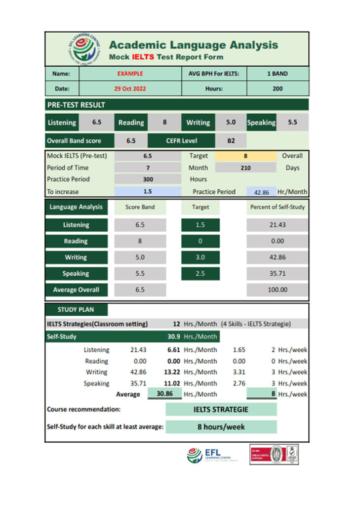 One IELTS course is usually 12 hours of teacher training and the progress of the student is reviewed after each course to determine how many additional teacher training hours are required in order to reach the target band score.